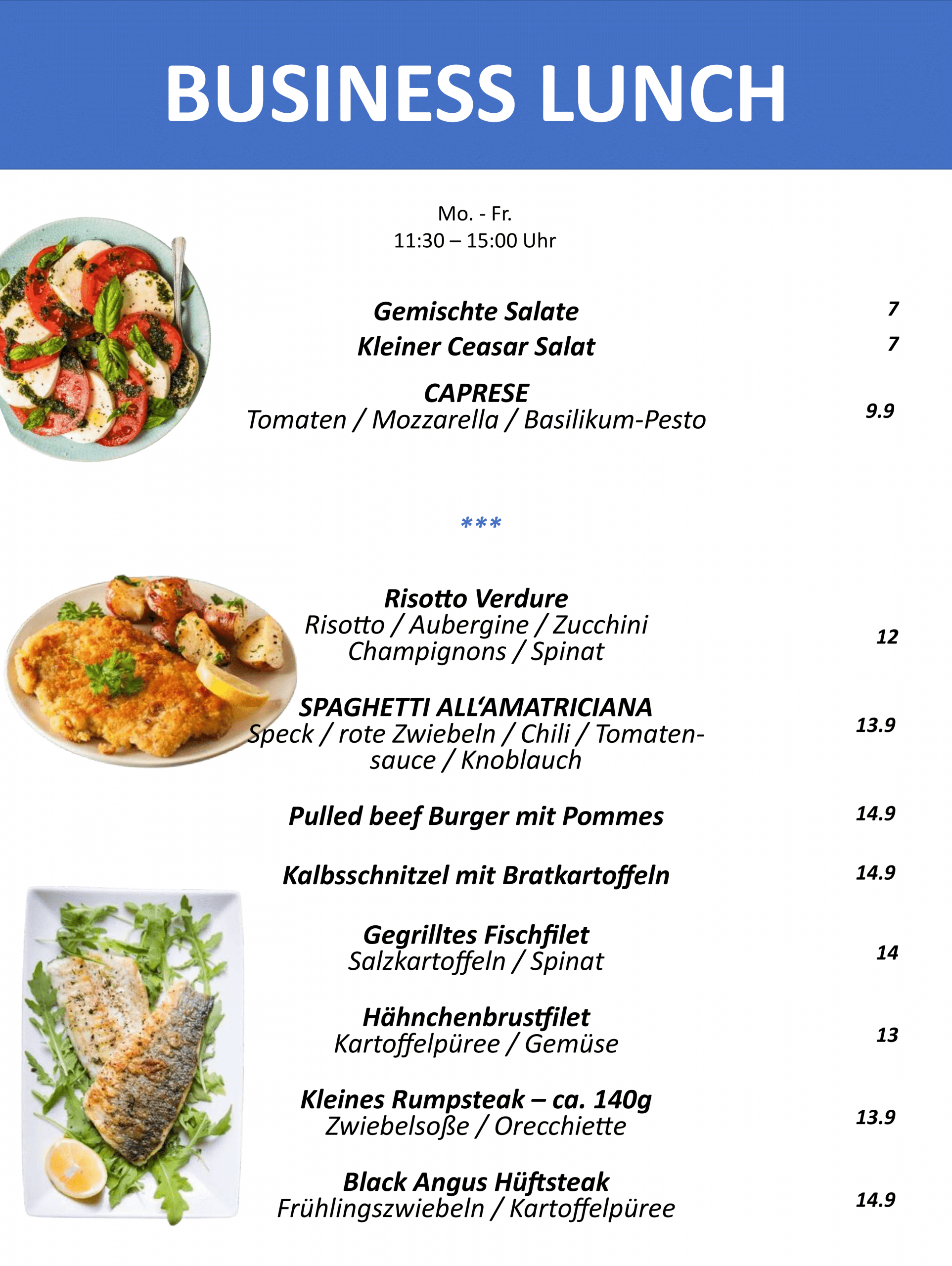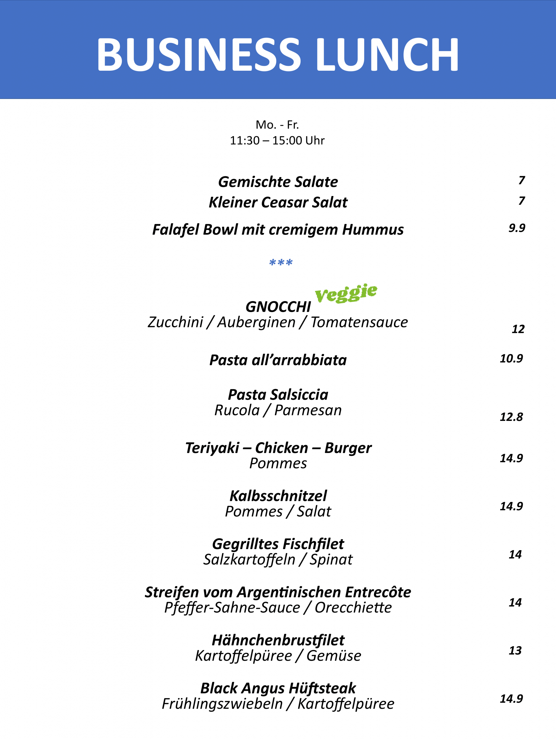 Genießen Sie unser Business Lunch – schnell, abwechslungsreich und lecker. Ideal für eine entspannte und köstliche Pause während Ihres Arbeitstages.