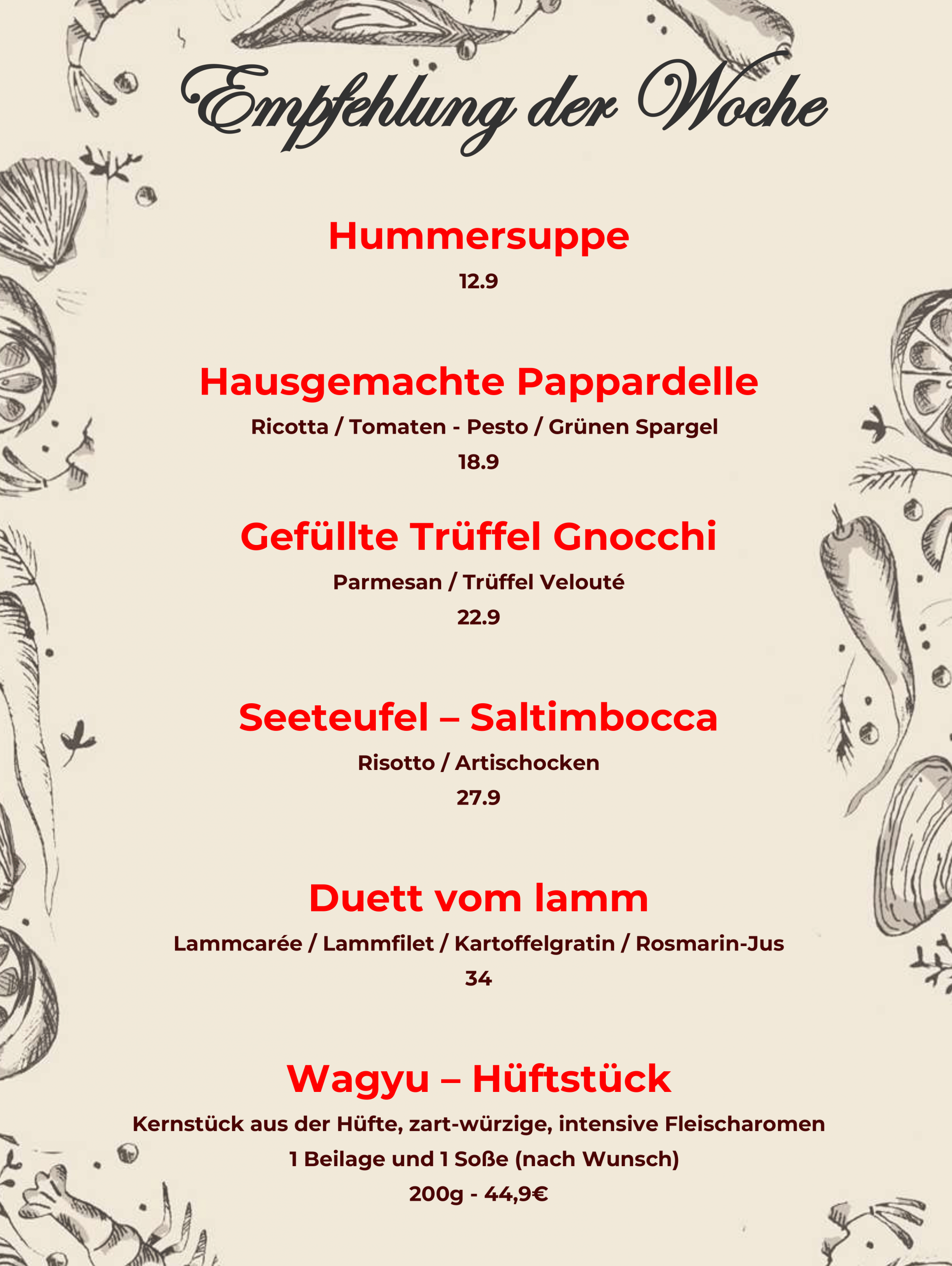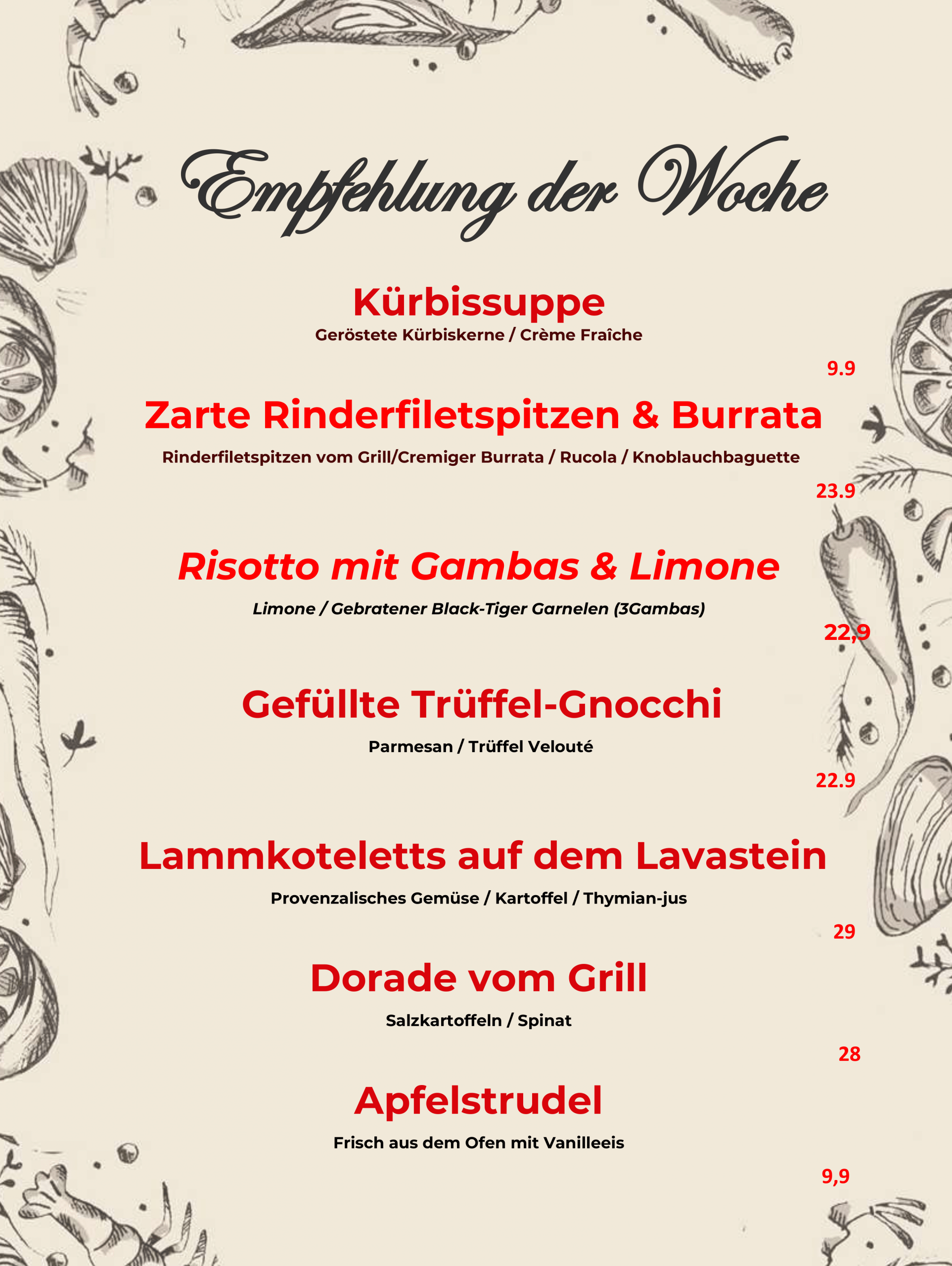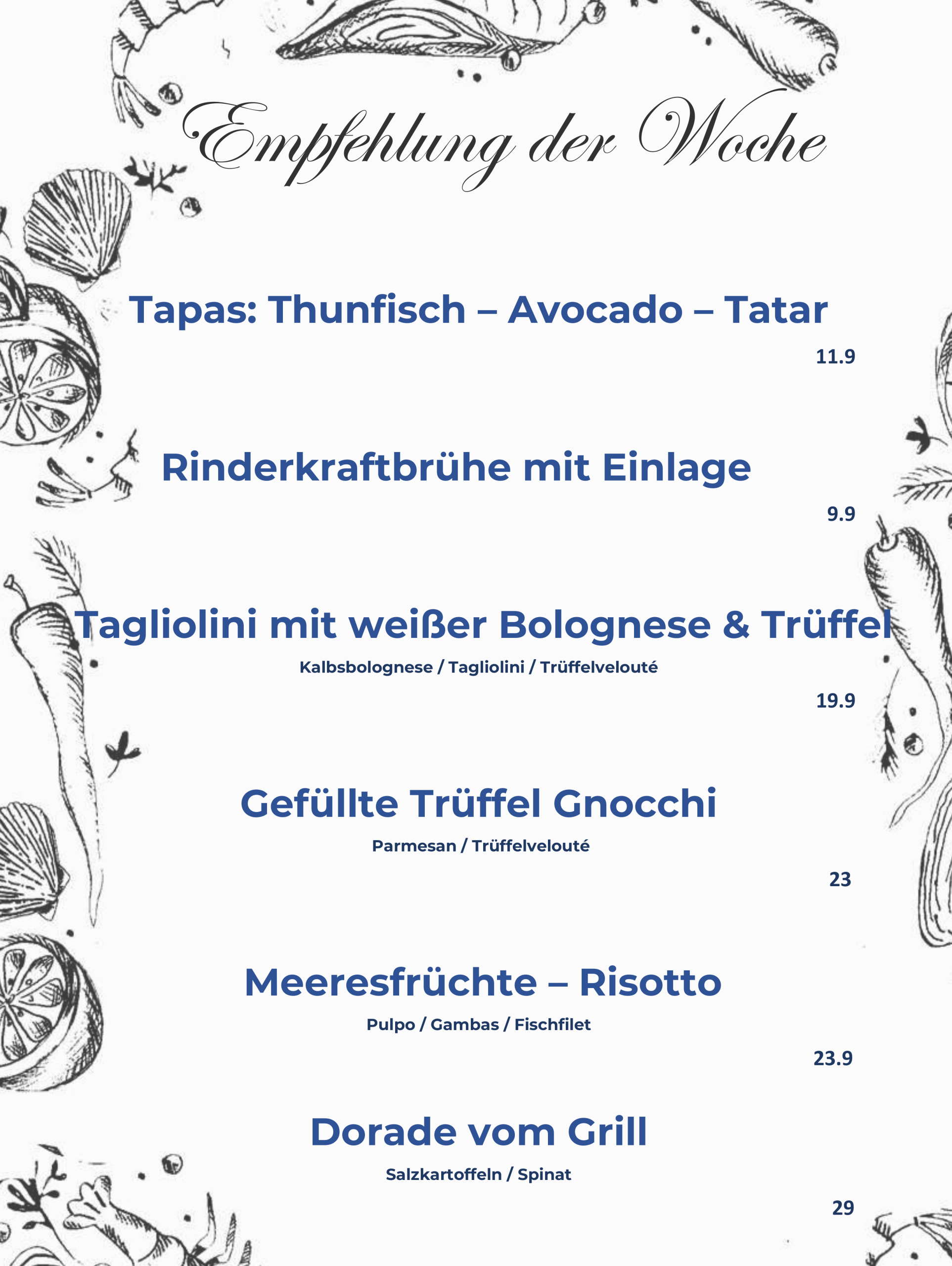 Entdecken Sie die kunstvolle Fusion von Aromen, die die Vielfalt und Fülle der mediterran inspirierten Küche präsentieren. Freuen Sie sich auf eine Auswahl kleiner Teller, die mit viel Liebe zum Detail kreiert wurden, um Ihre Geschmacksknospen zu begeistern.